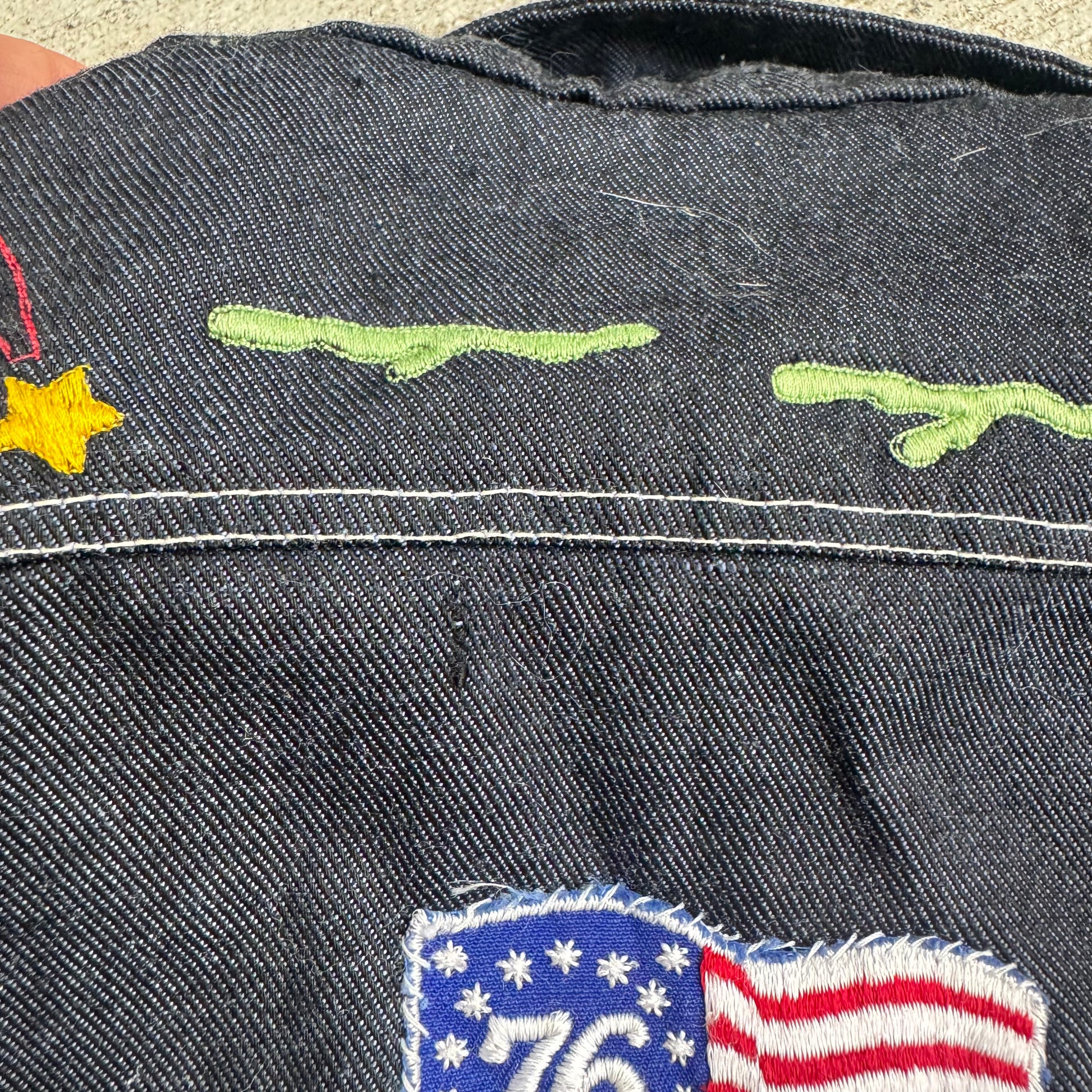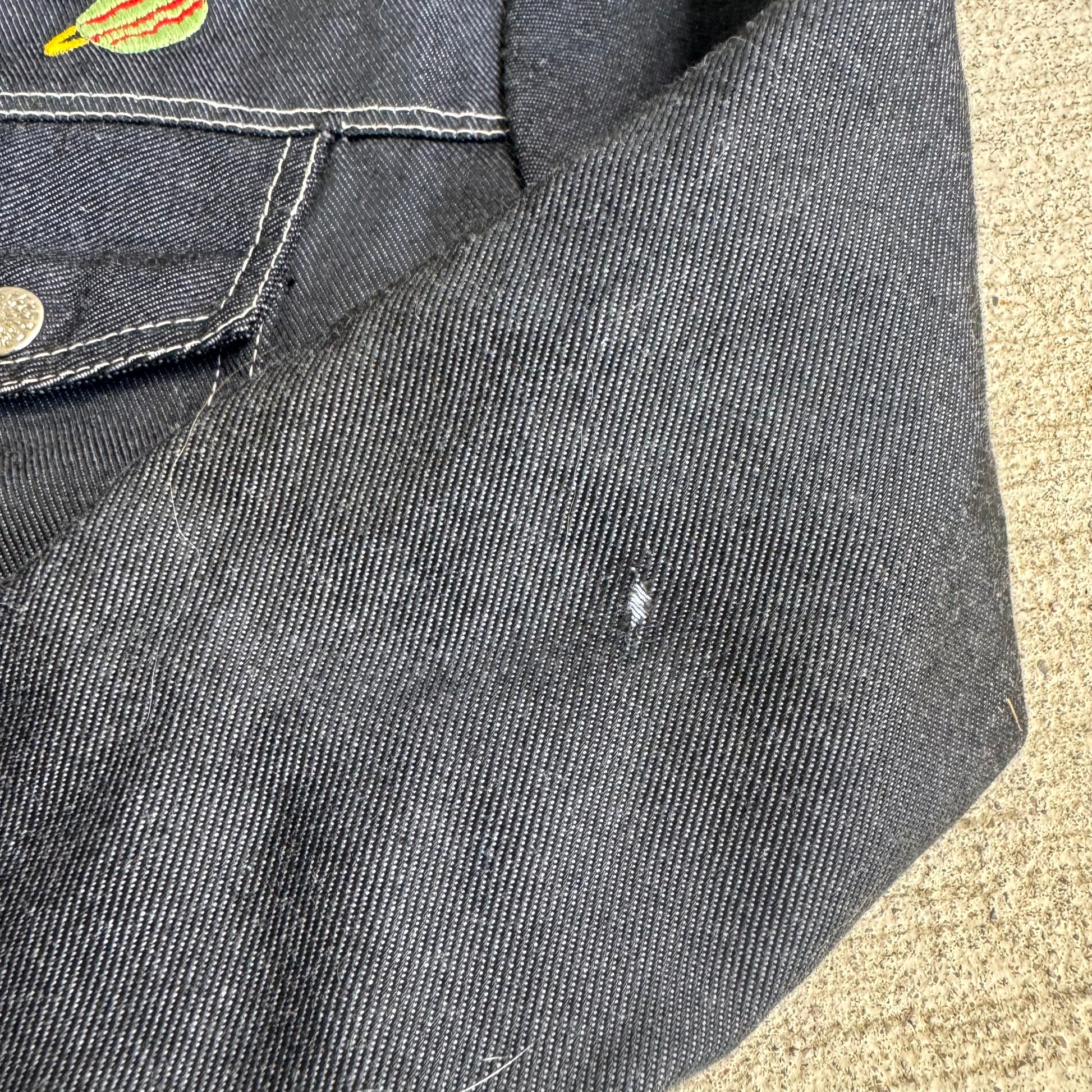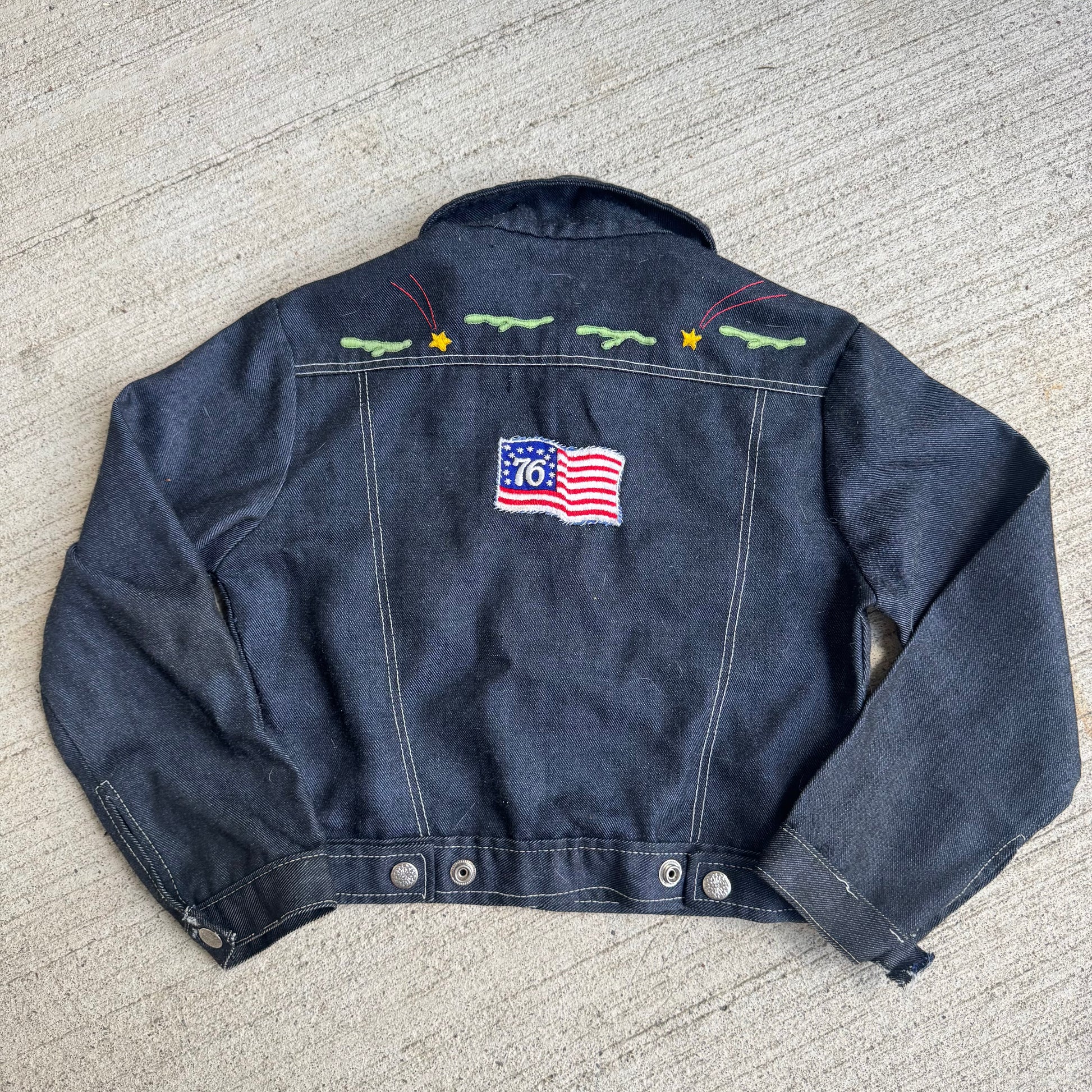 80s Kids Toddler Vintage Dark Denim Snap Double Pocket Long Sleeve Jacket With Cute Embroidered Patches Front And Back 4Y 5Y