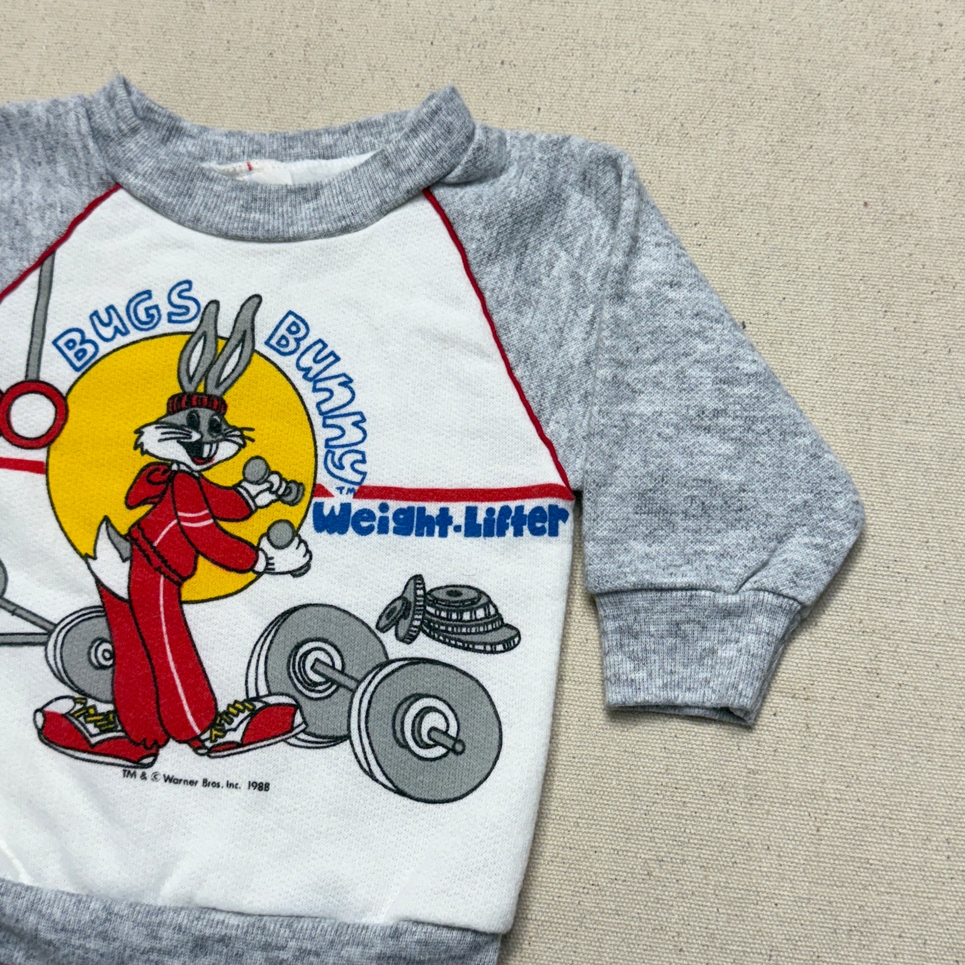 1988 80s Kids infant Baby Vintage Bugs Bunny Weight-Lifter Gray Raglan Sleeve Sweatshirt / 0m 3m 6m